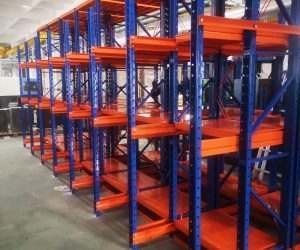 重型移動式貨架由重型托盤式貨架演變而成,裸露式結構,每兩排貨架置于底座之上,底座設有行走輪,沿軌道運行,底盤內安裝有電機及減速器、報警、傳感裝置等。系統僅需設1~2個通道,空間利用率極高。結構與輕中型移動式貨架類似,區別在于重型移動式貨架一定是電動式的,貨物由叉車進行整托存取,通道通常為3m左右,主要用于一些倉庫空間不是很大、要求最大限度地利用空間的場所,適用于機械制造等行業。